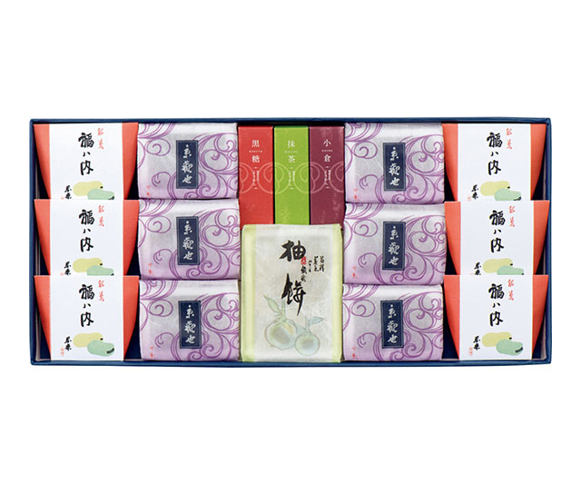 - 京観世×6、柚餅×1、福ハ内×6、鶴屋吉信ようかん(小倉・抹茶・黒糖×各1)