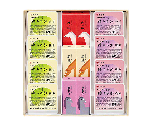 - 干支パッケージ小形羊羹(夜の梅・おもかげ・新緑×各2)各50g、やわらか羊羹ゆるるか(御膳・抹茶×各4)各55g