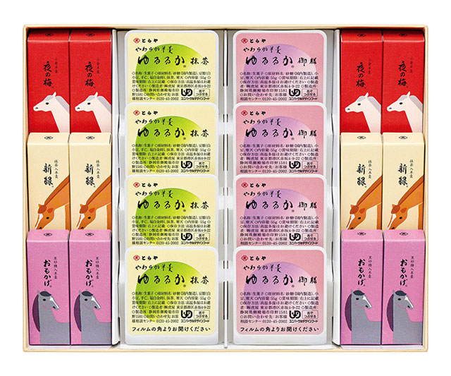 - 干支パッケージ小形羊羹(夜の梅・おもかげ・新緑×各4)各50g、やわらか羊羹ゆるるか(御膳・抹茶×各4)各55g