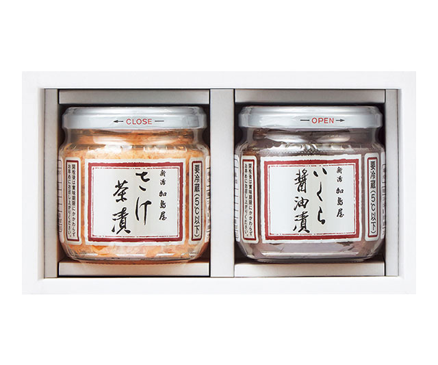 〈加島屋〉は信濃川や阿賀野川で獲れる鮭や鱒などの塩干物を商う店として、安政2年(1855年)創業。以来、素材を吟味し、昔ながらの製法で、新潟の風土と食文化に育まれた郷土の味をつくり続けています。深い旨みとコクが口に広がる「いくら醤油漬」など、丹精込めた美味をご賞味ください。