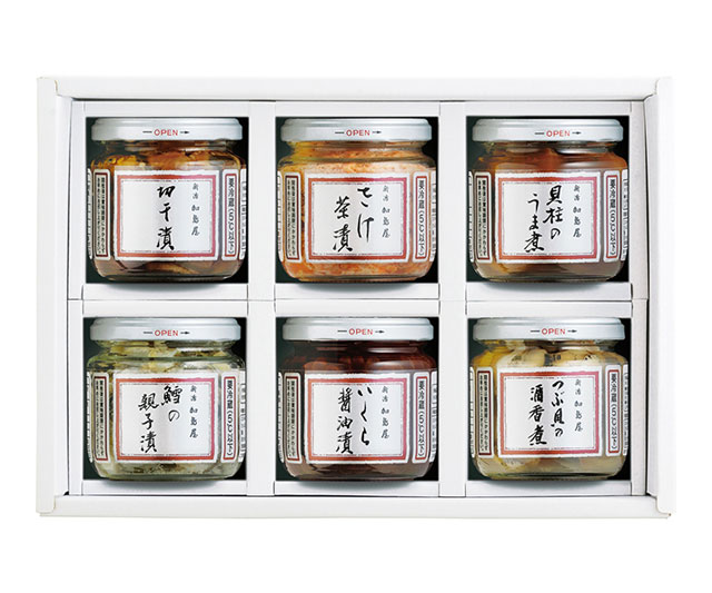 - さけ茶漬130g、いくら醤油漬・鱈の親子漬各160g、切干漬170g、貝柱のうま煮100g、つぶ貝の酒香煮90g