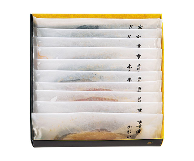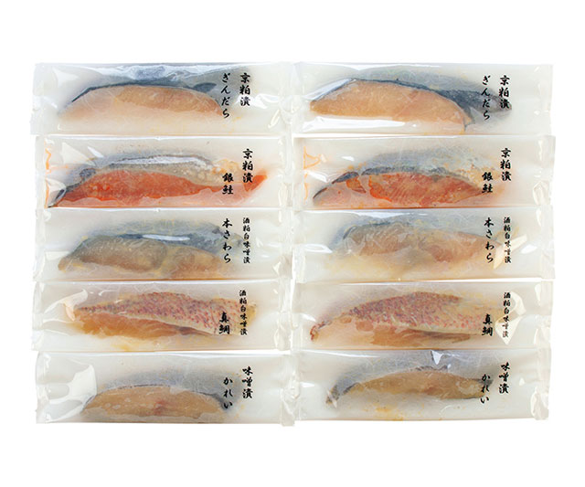 京粕漬(ぎんだら・銀鮭×各2)、酒粕白味噌漬(本さわら・真鯛×各2)、味噌漬(かれい×2)