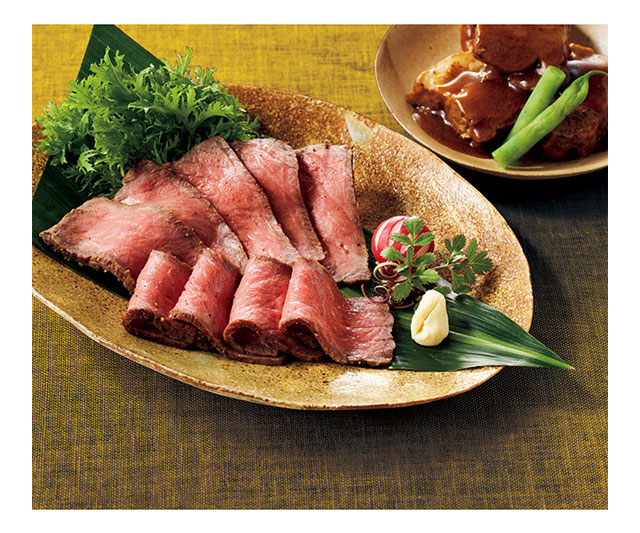 - 黒毛和牛ローストビーフ270g・ローストビーフソース30g・レフォール(西洋わさび)3.5g×各1、黒豚の角煮200g×2