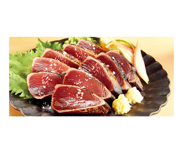 藁の炎で一本ずつ表面を一気に焼きあげた、風味豊かな鰹のたたき。本場高知では定番の「塩たたき」に使う天日塩や、ゆず風味のたれもお付けします。