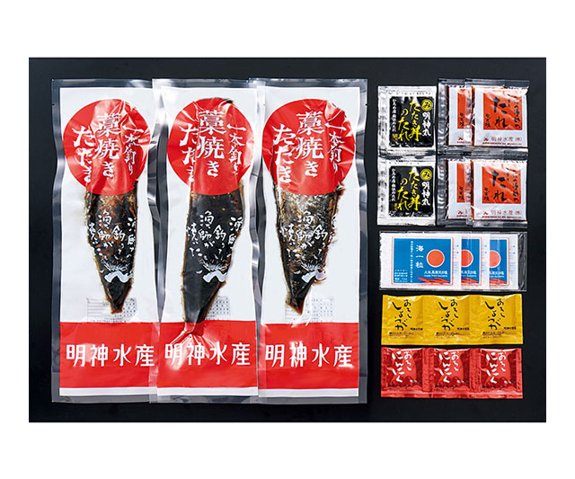 - 藁焼き鰹たたき3節(計600g)、タタキのタレ20ml×4、たたき丼のタレ18ml×2、天日塩10g・おろしにんにく5g・おろししょうが8g×各3