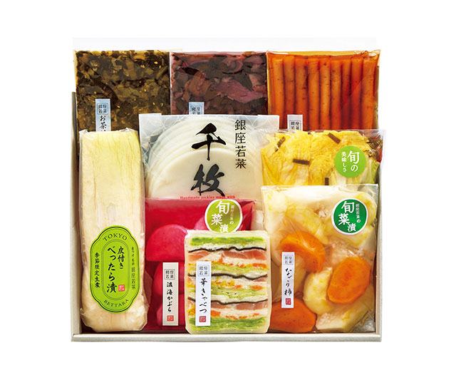 - 皮付きべったら漬半割1本、なごり柿180g、柚子白菜250g、華きゃべつ115g、千枚漬120g、温海かぶら130g、お茶漬高菜90g、しそしば漬80g、江戸ごぼう太100g