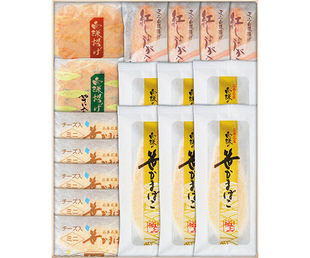 極上笹かまぼこ×7、白謙揚げ・野菜揚げ・ミニ紅しょうが揚げ・チーズ入りミニ笹×各5