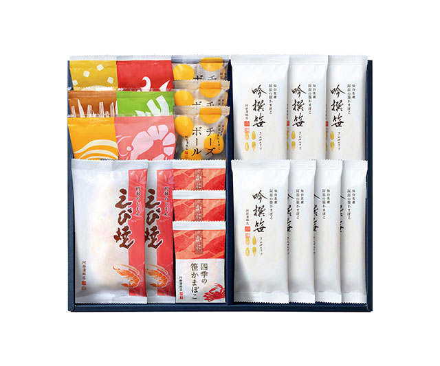 吟味した白身魚の香りや旨み、歯応えを引き出した笹かまぼこ「吟撰笹」、むきえびを贅沢に使った冬季限定「えび焼」など味わい豊かな詰合せです。