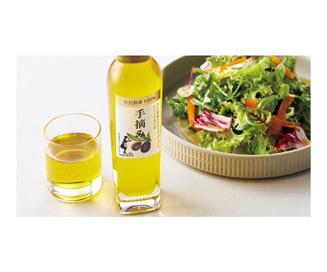 小豆島の太陽の光を浴びて育ったオリーブを手摘みし、新鮮なうちに搾ったエキストラバージンオイル。フルーティな香りとやさしい味わいが特徴です。