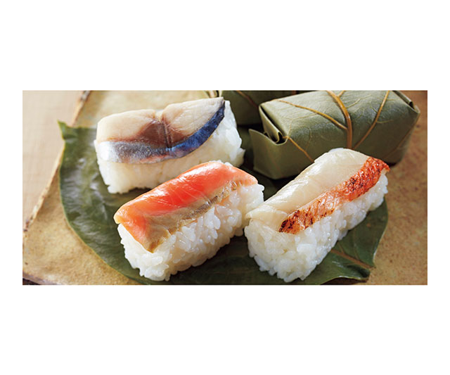 さば、さけ、炙り金目鯛の切り身をすし飯にのせ、香り豊かな柿の葉に包んだ「柿の葉すし」。電子レンジで簡単に美味しくお召しあがりいただけます。