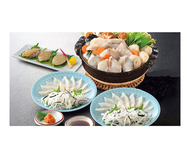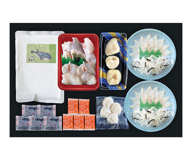 とらふぐ刺身12g・とらふぐ皮20g×各2(17pプラスチック皿盛)、とらふぐちり(身・あら)200g・とらふぐ焼き白子60g・ふぐつみれ40g・ふぐちりスープ300g×各1、ふくポン酢・もみじおろし各10g×各5(とらふぐは国産・養殖)(2人前)