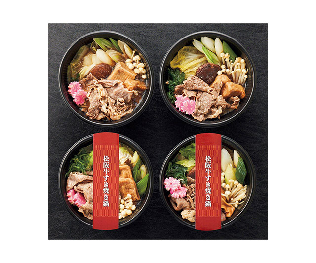 上品な旨みと肉本来の味わいが楽しめる松阪牛のすき焼。野菜やお麩などの具材を加えて仕上げました。電子レンジで温めるだけで手軽にお召しあがりいただけます。