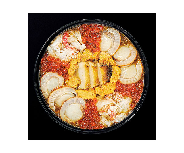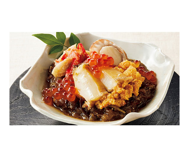 やわらかく煮あげたあわび、三陸産の焼きうに、酒蒸しした帆立、濃厚ないくらやかにを、めかぶ醤油漬にトッピング。多彩な海の幸を一度に味わえる一品です。