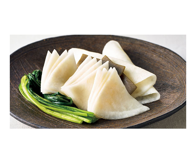 京都亀岡産のかぶらを薄く切り分け、利尻昆布を用いて漬け込みました。かぶらのパリッとした食感に昆布の旨みと甘酸っぱさが広がる、京の冬の味です。