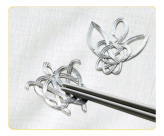 長寿の象徴である鶴と亀がモチーフの箸置。素材に錫を使用しているため、やわらかな質感と上品な光沢が感じられます。