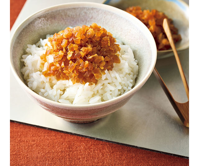 愛知県の伝統野菜「守口大根」を使った「守口漬」のふりかけです。仕上げ漬けで形が悪いなどの理由で商品化しなかった守口漬を丁寧に細かく刻み、程よい食感を残しました。シャキシャキとした歯ごたえと、酒粕の上品な甘みをお楽しみいただける一品。ご飯にはもちろん、玉子焼の具材としてもおすすめです。