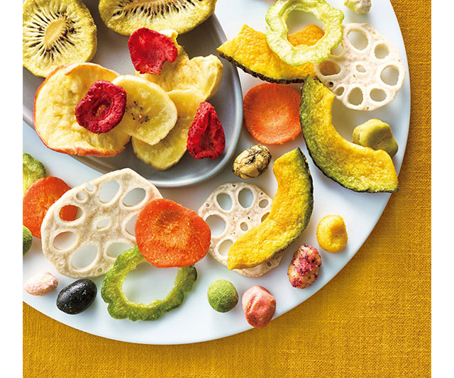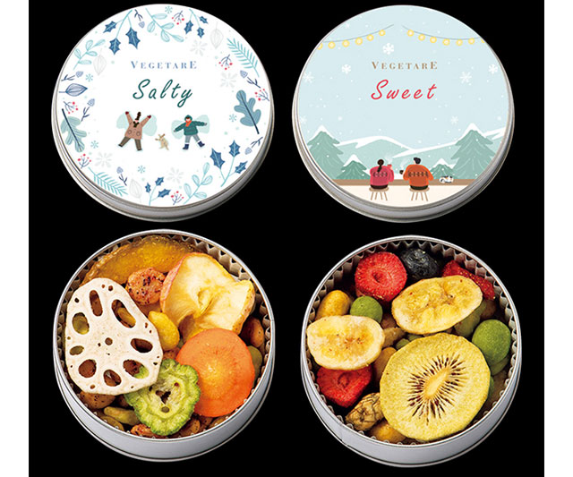 軽やか食感のチップスと、多彩な豆菓子を限定缶に詰め合わせました。野菜チップスと黒胡椒やカレー風味などの豆菓子の「SALTY(ソルティ)」と、果物チップスと抹茶ミルクなどの豆菓子が入った「SWEET(スイート)」のセット。市場に出回らない「紅ほっぺ」や「おいCベリー」を使用した「苺」など、素材の風味を活かした味わいをお楽しみいただけます。