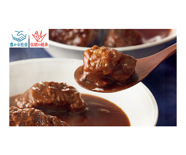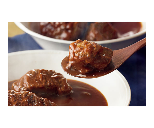 香味野菜とじっくり煮込むこと一昼夜。口の中でとろけるように柔らかくなったあか牛肉と、デミグラスソースの奥深い味わいをご賞味ください。