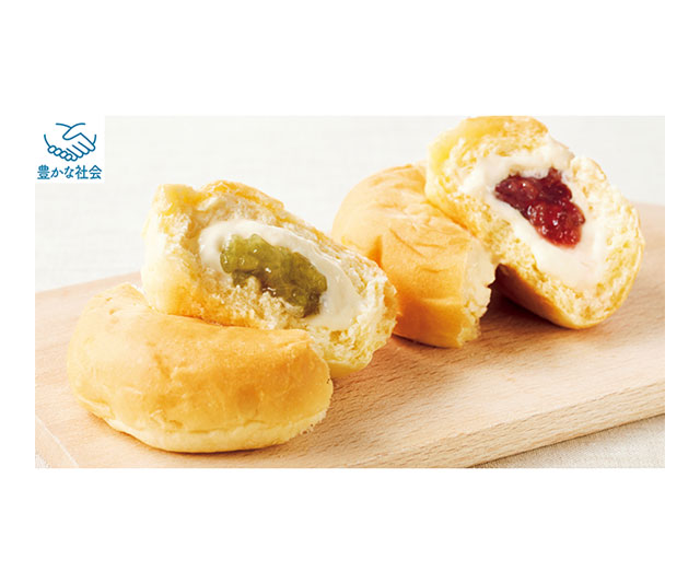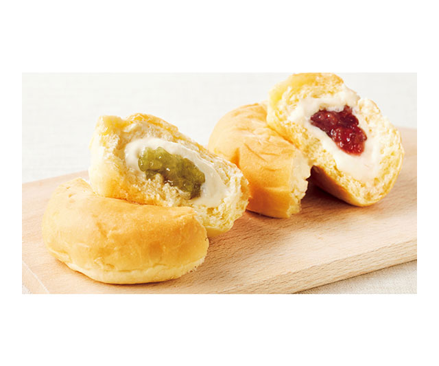芳醇な香りのマスカットジャムを、ふんわりとした生地のパンで包みこみました。爽やかな甘さの赤ぶどうのくりーむパンとセットでお届けします。