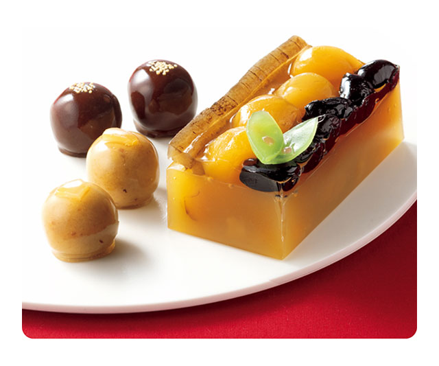 黒糖で炊いた餡を寒天で包んで仕上げた〈亀屋良長〉の代表銘菓「烏羽玉」をはじめ、限定フレーバーの「烏羽玉栗きんとん」、栗入芋羊羹をベースに縁起のよい栗・黒豆・ごぼうをあしらった「おせち羊羹」を詰め合わせました。