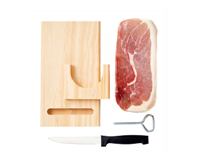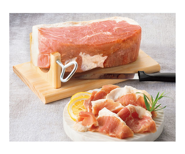 豚もも肉を塩だけで熟成させた、素材本来の旨みを楽しめるプロシュット。お好みで切り分けられるよう、台とナイフも付けた本格的なセットです。