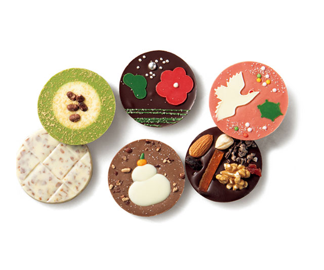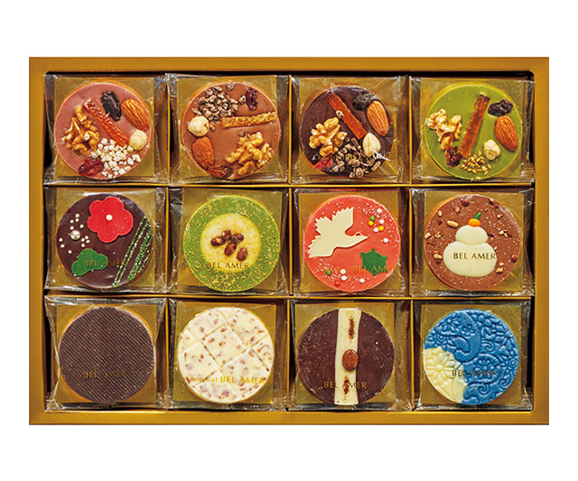 新年への願いを込めてつくられた〈ベルアメール〉の特別なパレショコラ。鶴や亀、梅の花など吉祥のモチーフをあしらった「縁起パレショコラ」4種と、定番の「パレショコラ」8種をセットにしました。