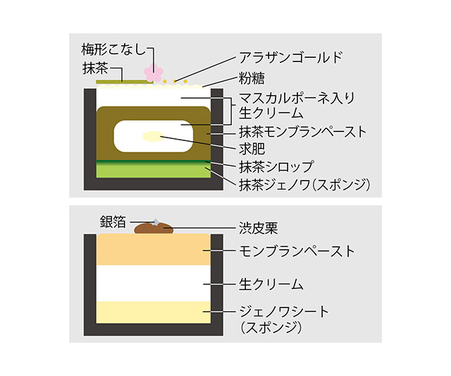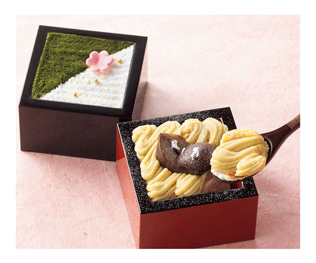 信州伊那栗のペーストと生クリーム、スポンジを重ね、上品な甘さに仕上げたモンブラン。庭園をイメージした、ほろ苦い味わいの抹茶ティラミスモンブランとセットでお届けします。トッピングの銀箔や庭園に佇むような梅の花が、上品に福を彩ります。