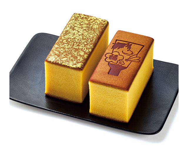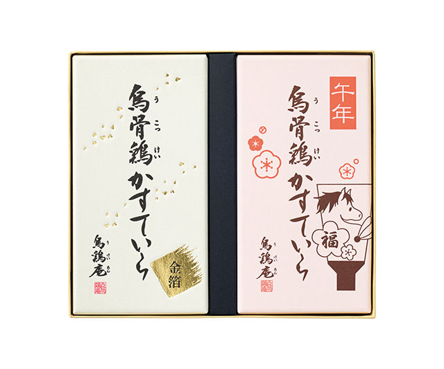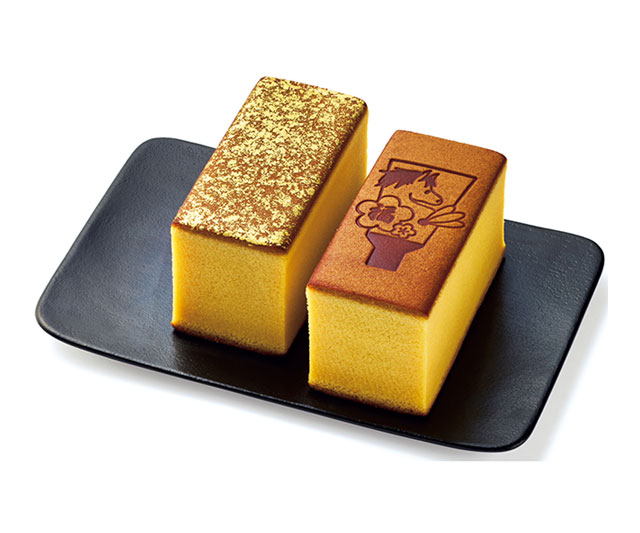 濃厚でまろやかな味わいの烏骨鶏(うこっけい)の卵を使用。ひとつひとつ丁寧に焼きあげた、しっとり食感のかすていらです。午の焼き印入りと金箔をまぶした2種をご用意しました。おめでたい見た目も喜ばれる、味わい深い一品をお届けします。