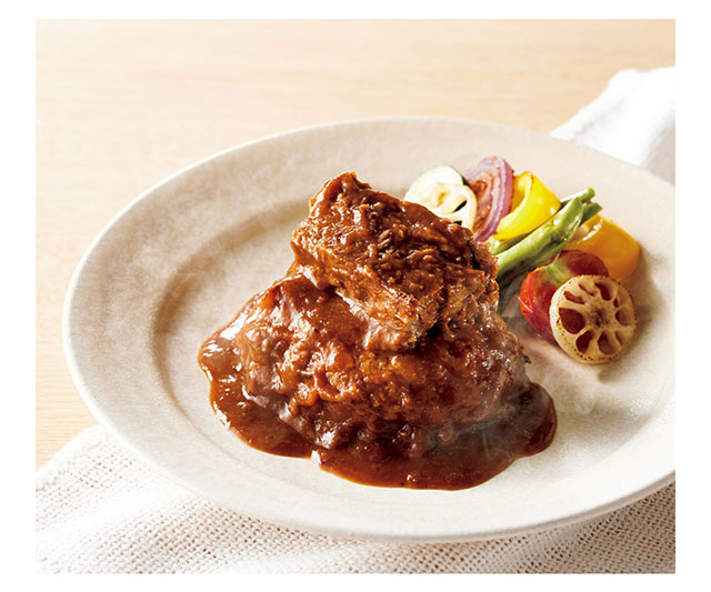 米沢牛を100%使用した、ジューシーで食べごたえのあるハンバーグ。〈米沢牛黄木(おおき)〉の直営レストラン「金剛閣」がレシピを監修したビーフシチューと、ホロホロな食感のすね肉を合わせました。香味野菜と、甘みを加える果実酒などで、じっくりと煮込んだビーフシチューが、お肉の旨みを引き立てています。