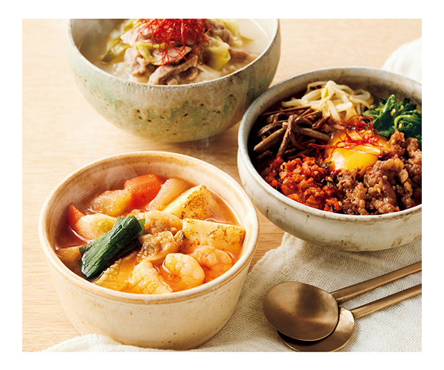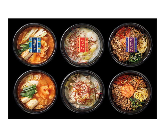 焼肉屋でお馴染みのメニューを、素材や製法にこだわって特別仕立てでつくりあげました。海の幸をふんだんに使ったチゲ鍋は、牛肉や海鮮具材のだしと辛みが溶けあう、旨みあふれる濃厚な味わい。まろやかでコク深いクッパや、黒毛和牛を使用したキムチビビンバも入ったボリュームたっぷりの詰合せです。