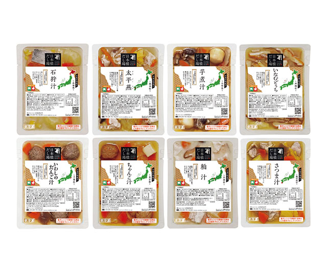 かつお節専門店〈にんべん〉が、日本各地の郷土料理を楽しめる、具だくさんスープセットをご用意。専門店ならではのかつおと昆布の合わせ出汁が、具材の旨みを存分に引き立てています。