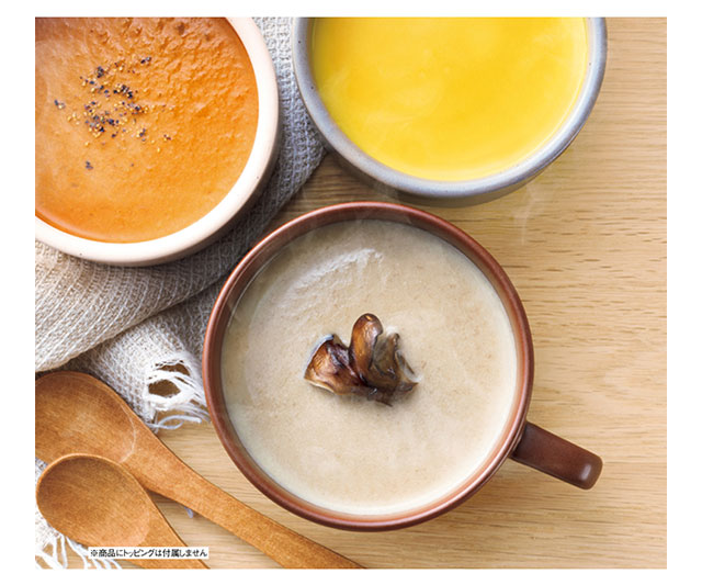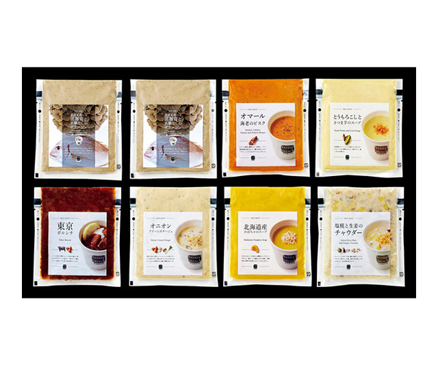 - 素材を食べる黒舞茸と真鯛出汁のポタージュ×2、オマール海老のビスク・東京ボルシチ・塩糀と生姜のチャウダー・北海道産かぼちゃのスープ・オニオンクリームポタージュ・とうもろこしとさつま芋のスープ×各1、各180g