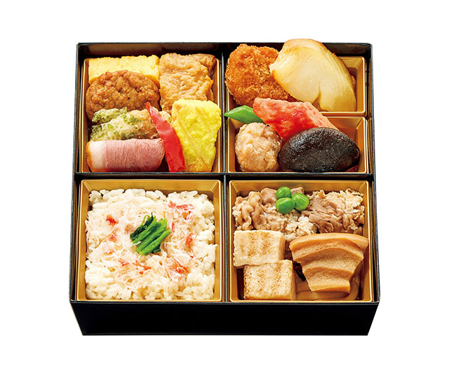 1830年創業の〈日本料理なだ万〉が丁寧な仕事でつくりあげたお祝い御膳をご紹介します。紅白に彩ったずわい蟹ご飯に、海老つみれや旨みたっぷりの牛すき焼、脂ののった鰈の西京焼などを上品に盛り付けて仕上げました。老舗の世界観を表現した、美しく滋味深い味わいを、折箱ごと電子レンジで温めるだけで簡単にお召しあがりいただけます。