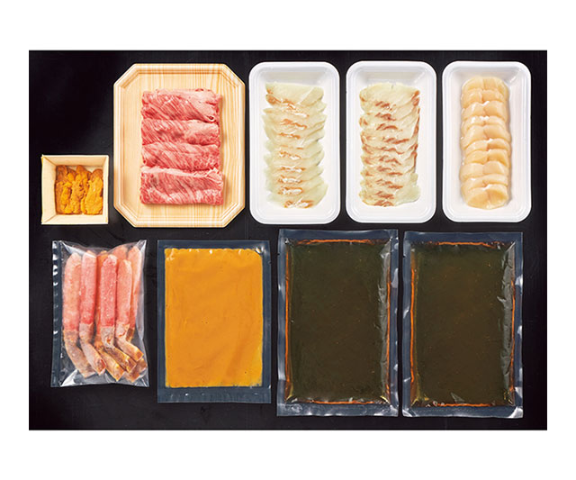 - ひらめスライス70g×2、生うに25g・黒毛和牛肩ロース肉しゃぶしゃぶ用150g・帆立貝柱80g・生ずわい蟹棒肉剥き身175g×各1、しゃぶしゃぶ用出汁300g×2、うに出汁100g×1(2〜3人前)