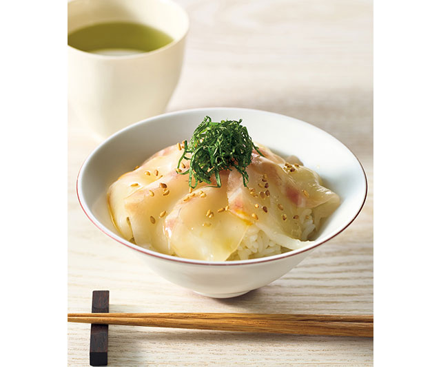 鯛の刺身を特製のタレにつけ込み、薬味と一緒にご飯にのせて食べる郷土の味わいです。口の中に広がる、脂がのった鯛の旨みを存分にお楽しみください。持続可能な水産養殖に関する国際認証制度「ASC認証」を取得したゆら鯛のみを使用しています。