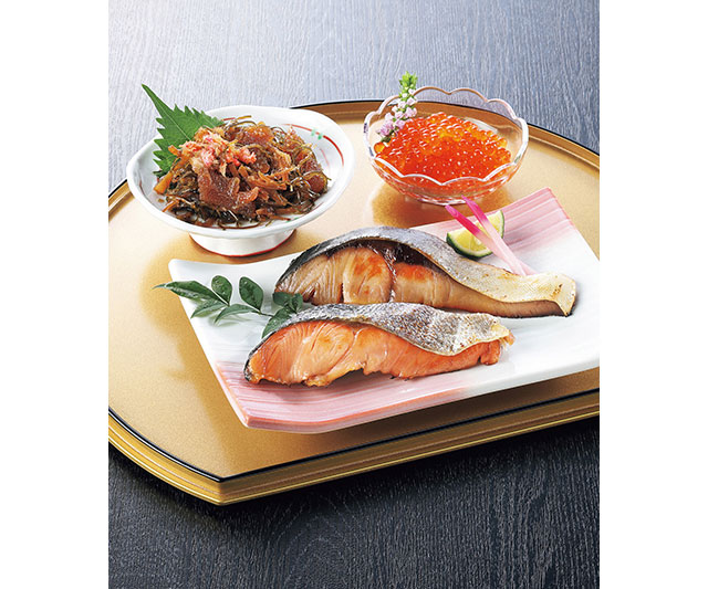 - 西京漬(鮭、ぶり、真だら、アラスカメヌケ)、松前漬(ズワイガニ入り)110g、いくら醤油漬60g