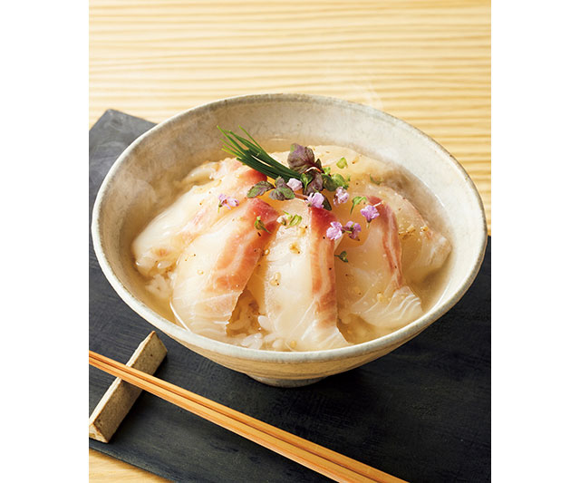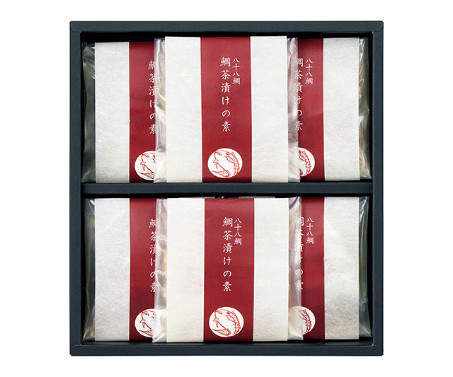 愛媛県のブランド真鯛「八十八鯛」を使用。特殊技術で血抜きを行った真っ白な身が特徴の真鯛を、味噌風味のだしと合わせた茶漬けに仕上げました。湯を注ぐと鯛のアラからとっただしの香りが立ちあがります。