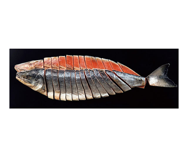 西別鮭のオスに粗塩をすり込み山積みし、旨みが浸透するまで上下を入れ替えて熟成させました。一切ずつ個包装なので保存にも便利です。