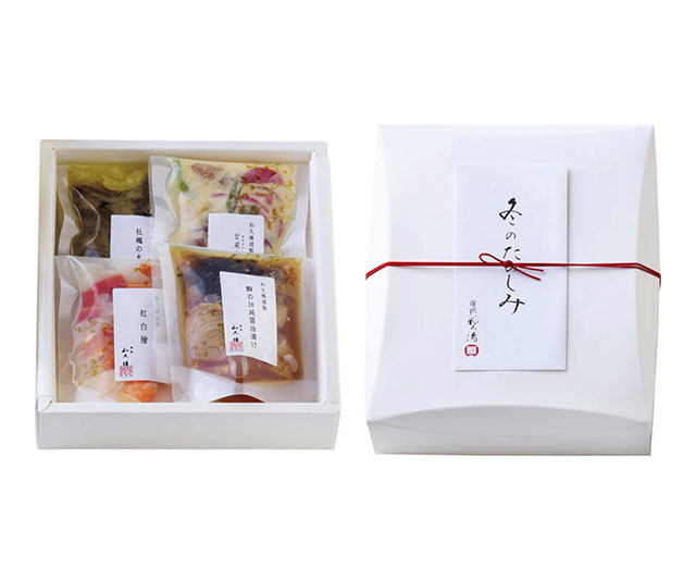 京都の伝統と現代的な感性を融合させた〈紫野和久傳〉の味をご家庭で。鰤を柚子胡椒が香る醤油たれに漬け込んだ「鰤の加減醤油漬け」、おろした蕪に海老やにんじんなどを加えて甘酢漬けした「紅白膾」など、冬の食材で仕立てた品々です。
