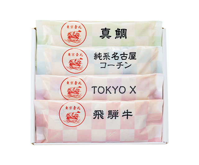 飛騨牛サーロイン肉・TOKYO Xロース肉・純系名古屋コーチンモモ肉各100g、真鯛65g