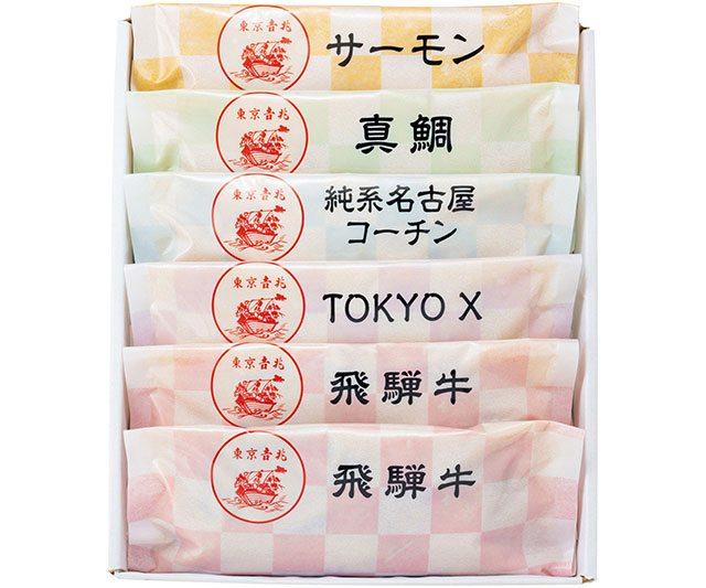 飛騨牛ヒレ肉・サーロイン肉・TOKYO Xモモ肉・純系名古屋コーチンモモ肉各100g、真鯛・アトランティックサーモン各65g