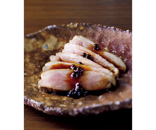 絶妙に火入れした合鴨ロースを風味豊かな特製の実山椒醤(ひしお)で。