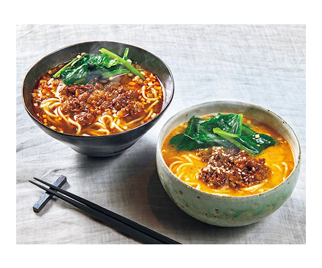 特製麻辣醤ベースのスープに粗挽きの肉みそを添えた「麻辣(マーラー)麺」は、山椒香るスパイシーな味わい。練りごまベースのスープと粗挽きした肉みそを合わせた「担々麺」は、まろやかな辛みが魅力です。お好みで葱や青菜を添えても美味しく召しあがれます。