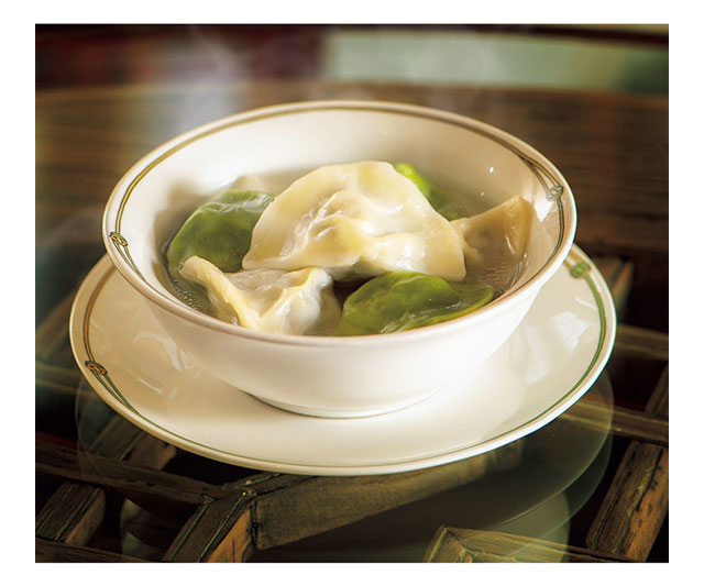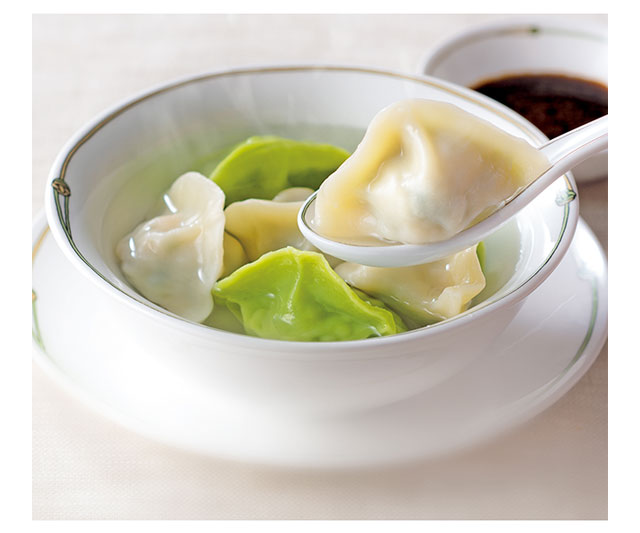 手延べ製法による皮のもちもちした食感が人気の、手づくり水餃子。「青菜とハス」、「ニラと海老」の2種に、黒酢ベースの特製ダレをお付けしました。