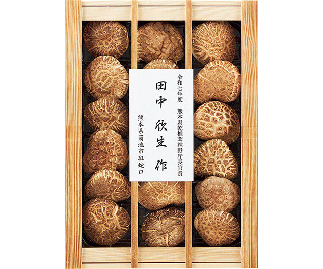 熊本県の若き椎茸生産者 田中欣生氏がつくるどんこ椎茸は、2025年度熊本県椎茸農業組合品評会 林野庁長官賞を受賞。料理を引き立てる独特の旨みと、しっかりと肉厚で食べごたえがあるのが特徴です。この時期のご進物におすすめです。