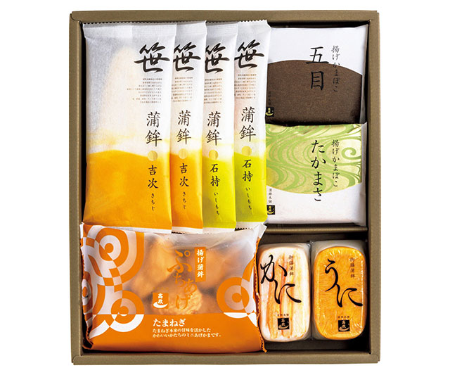 - 笹かまぼこ(吉次・石持×各2)、揚げかまぼこ(たかまさ・五目×各1)、御膳蒲鉾(かに・うに×各1)、ぷちあげたまねぎ×1