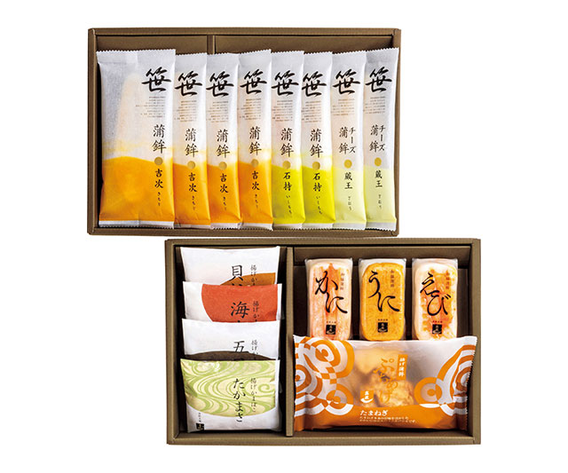 - 笹かまぼこ(吉次×4、石持×2)、チーズ笹かまぼこ蔵王×2、揚げかまぼこ(たかまさ・五目・海老・貝柱×各1)、ぷちあげたまねぎ×1、御膳蒲鉾(かに・うに・えび×各1)