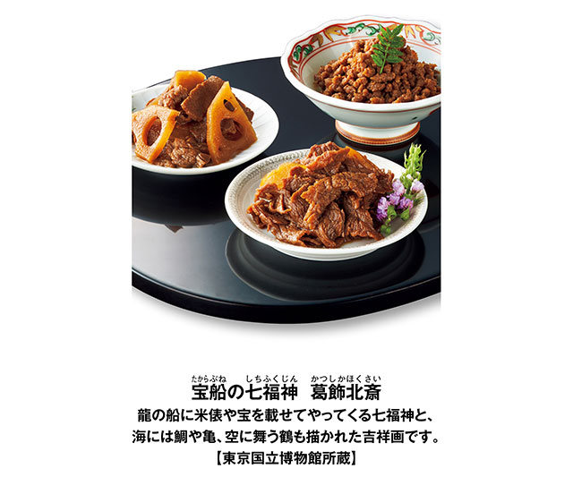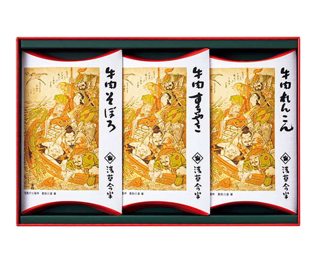 国産牛肉をすき焼風の味わいで柔らかく煮あげた「牛肉すきやき」、歯触りのよい「牛肉れんこん」など3種の牛肉佃煮を詰め合わせました。葛飾北斎の「宝船の七福神」をあしらった縁起のよい限定缶でお贈りします。