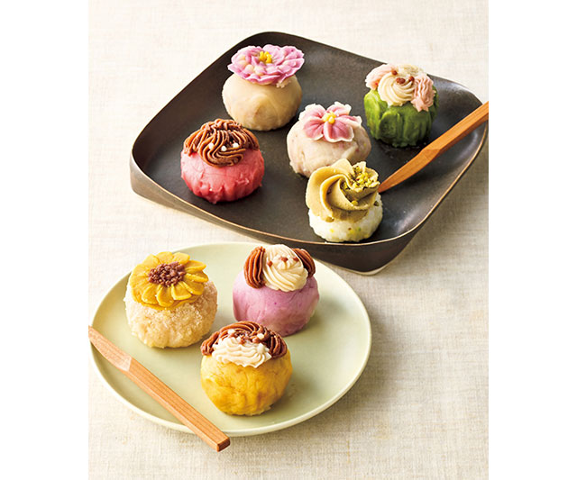 おはぎ専門店〈うめとおはぎ〉がお届けする、わんこと花の一口おはぎです。華やかな花やかわいい犬たちは、素材本来の色だけで表現。てんさい糖のやさしい甘みが特徴です。