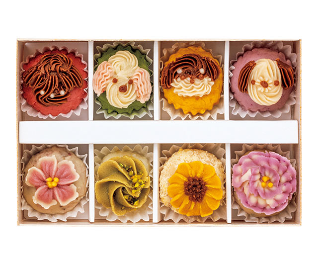 - トイプードルと木苺チョコ、コッカースパニエルとお煎茶つぶ餡、シュナウザーと南瓜みたらし、ビーグルとお芋、古都の一輪桜、ピスタチオピスタチオ、向日葵とアーモンド、トルコききょうと紫芋